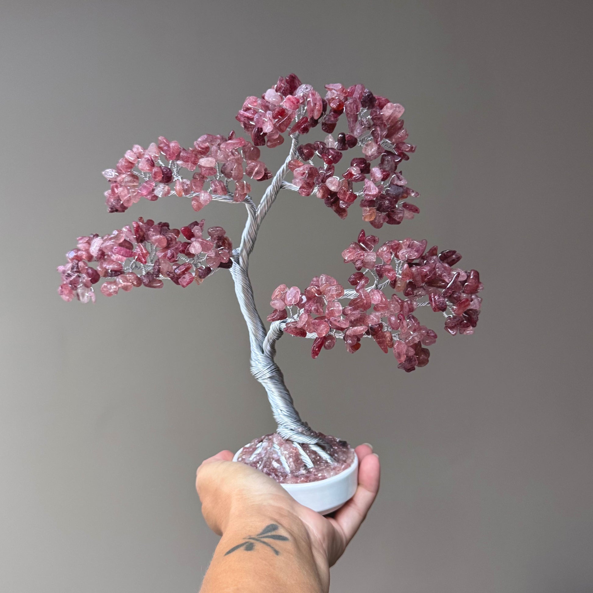 420 stones on the tree. The base is filled with Strawberry Quartz.
